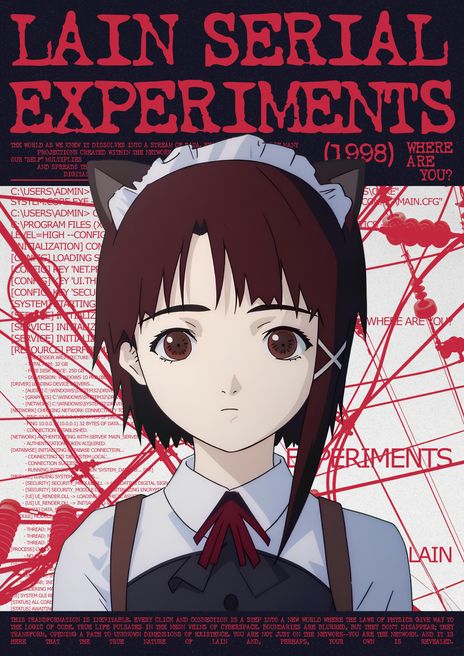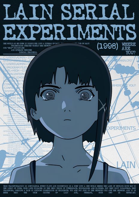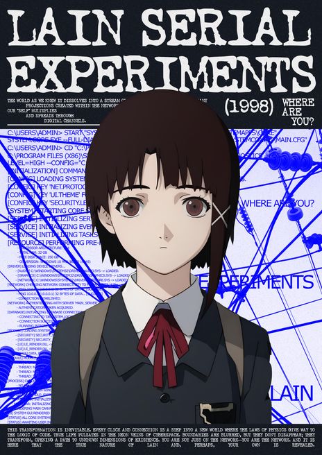 Это не просто плакат, а погружение в атмосферу культового аниме «Эксперименты Лейн». Дизайн выполнен в стилистике, напоминающей сбой в старой операционной системе: синие экраны, строки кода и системные сообщения создают ощущение поломки реальности. В центре — главная героиня, Лэйн, чей взгляд устремлён прямо на зрителя. Плакат ставит вопрос «Где ты?», исследуя ключевую идею аниме: стирание границ между реальным и цифровым миром.