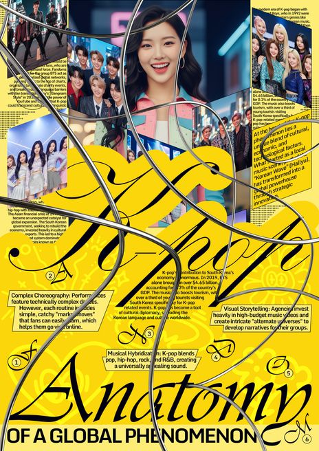 Среди сплетений металлических нитей, символизирующих мировую сеть, выделяется яркая фигура K-pop-звезды. Вокруг неё — динамичные образы артистов и ключевые слова, рассказывающие историю музыкальной революции. Этот плакат — путеводитель по миру K-pop, от истоков с Seo Taiji and Boys до современных фандомов, таких как ARMY. Он показывает, как музыка, сложная хореография и уникальный сторителлинг создали глобальный феномен.