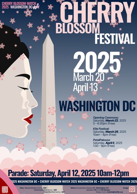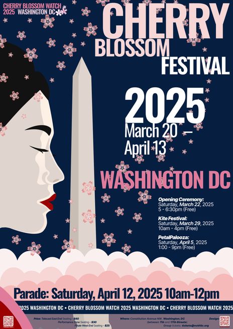 🌸 Cherry Blossom Festival celebrates Japanese sakura and traditions. Though rooted in Japan, it's been held in Washington, D.C. for over 100 years. I created 9 posters showing the day’s changing moods through color — here are the 3 most liked. A Japanese girl enjoys the moment under swirling petals. At the center: the Washington Monument, cherry trees, and lake reflections. The layout uses Oswald, Inter, and a modular grid with bold/italic accents for clarity.